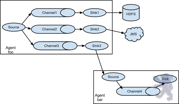 Agent使用JVM 运行Flume。每台机器运行一个agent,但是可以在一个agent中包含多个sources和sinks。