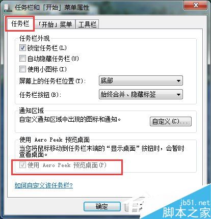 2、进入任务栏和开始菜单属性界面,单击“任务栏”选项卡,将下面“使用Aero Peek预览桌面”打勾,单击“确定”。