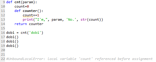 在 python 的函数内,可以直接引用外部变量,但不能改写外部变量,因此如果在闭包中直接改写父函数的变量,就会发生错误: