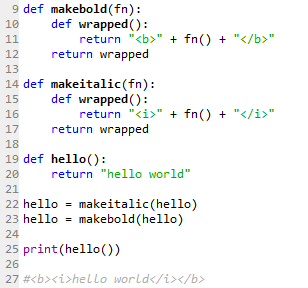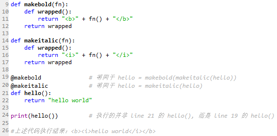 @makeitalic 装饰器将函数 hello 传递给函数 makeitalic,函数 makeitalic 执行完毕后返回被包装后的 hello 函数,而这个过程其实就是通过闭包实现的。@makebold 也是如此,只不过其传递的是 @makeitalic 装饰过的 hello 函数,因此最后的执行结果 <b> 在 <i> 外层,这个功能如果不用装饰器,其实就是显式的使用闭包: