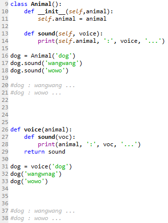 闭包的最大特点是可以将父函数的变量与内部函数绑定,并返回绑定变量后的函数(也即闭包),此时即便生成闭包的环境(父函数)已经释放,闭包仍然存在,这个过程很像类(父函数)生成实例(闭包),不同的是父函数只在调用时执行,执行完毕后其环境就会释放,而类则在文件执行时创建,一般程序执行完毕后作用域才释放,因此对一些需要重用的功能且不足以定义为类的行为,使用闭包会比使用类占用更少的资源,且更轻巧灵活,现举一例:假设我们仅仅想打印出各类动物的叫声,分别以类和闭包来实现: