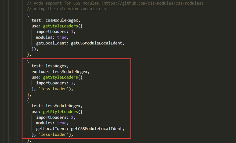 第一步:到webpack.config.dev.js文件中找到如下代码,在sassModuleRegex后面加上lessRegex和lessModuleRegex变量
