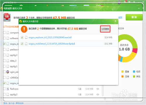 6、提醒是不是要删除文件,点击“立即删除”。这样就清理了一些不重要的大文件。个人评测:一般来说对于电脑用久了的,可以释放出几个GB的储存,算是比较可观的,这种方式清除的是你安装的软件所带来的c盘垃圾。