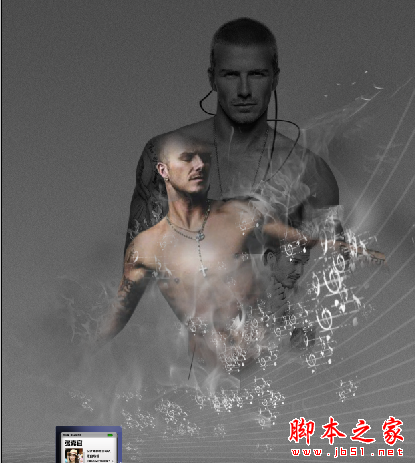 13、新建一个组,现在给海报添加人物,拖入准备好的素材(贝克汉姆),ctrl+u去色,添加图层蒙板,擦除边缘部分,效果如下