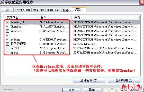 2、点选“启动”选项卡 →在下方主窗口中仅保留“ctfmon”选项 →点确定,立即重新启动。如下图: