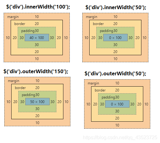 $('div').outerWidth('50');//content+30*2+20*2=50,content=0,padding,margin,border不变