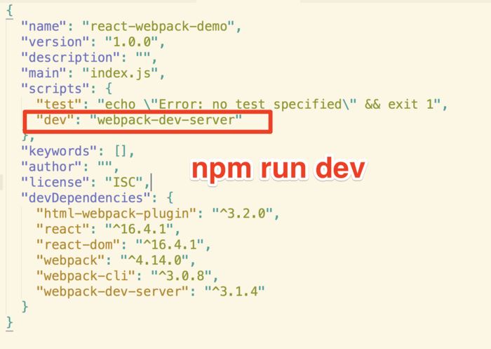 在package.json内scripts中添加"dev": "webpack-dev-server"