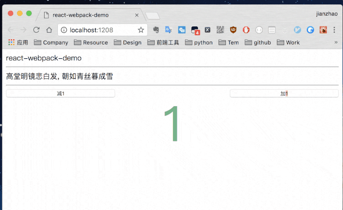 <!DOCTYPE html> <html lang="en"> <head> <meta charset="UTF-8"> <title>react-webpack-demo</title> </head> <body> react-webpack-demo <hr> 高堂明镜悲白发, 朝如青丝暮成雪 </body> </html>