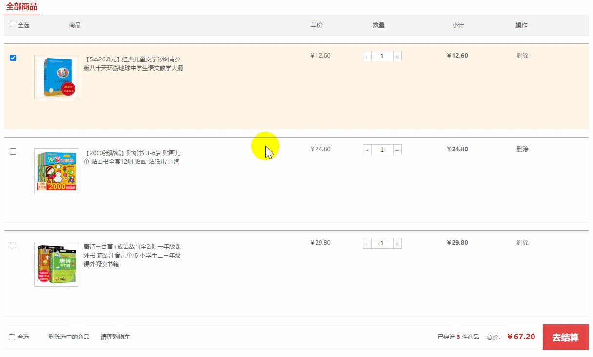 今天是一些购物车的基本功能实现,全选、增减商品数量、修改商品小计、计算总计和总和、删除商品、选中添加背景颜色等一些常见功能。