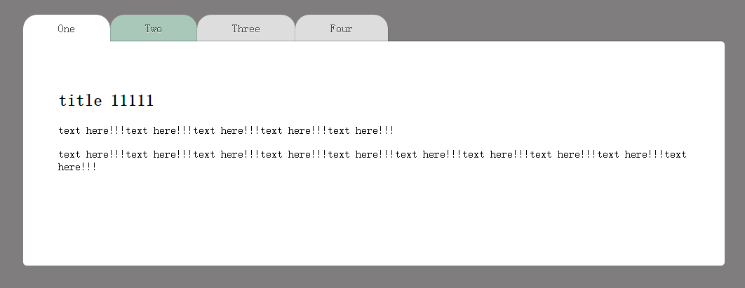 <!DOCTYPE html> <html lang="en"> <head> <meta charset="UTF-8" /> <title>tab标签</title> <link href="css/style.css" rel="external nofollow" type="text/css" rel="stylesheet"> </head> <body> <div class="tab-contain"> <!-- tab栏 --> <ul id="tabs"> <li class="current"><a href="#" rel="external nofollow" rel="external nofollow" rel="external nofollow" rel="external nofollow" title="tab1">One</a></li> <li><a href="#" rel="external nofollow" rel="external nofollow" rel="external nofollow" rel="external nofollow" title="tab2">Two</a></li> <li><a href="#" rel="external nofollow" rel="external nofollow" rel="external nofollow" rel="external nofollow" title="tab3">Three</a></li> <li><a href="#" rel="external nofollow" rel="external nofollow" rel="external nofollow" rel="external nofollow" title="tab4">Four</a></li> </ul> <!-- 对应显示内容 --> <div id="content"> <div id="tab1" class="item show"> <h2>title 11111</h2> <p>text here!!!text here!!!text here!!!text here!!!text here!!!</p> <p>text here!!!text here!!!text here!!!text here!!!text here!!!text here!!!text here!!!text here!!!text here!!!text here!!!</p> </div> <div id="tab2" class="item"> <h2>title 2222</h2> <p>text here!!!text here!!!text here!!</p> <p>text here!!!text here!!!text here!!!text here!text here!!!text here!!!text here!!!</p> </div> <div id="tab3" class="item"> <h2>title 33333</h2> <p>text here!!!</p> <p>text here!!!text here!!!text here!!!text here!!!text here!!!text here!!!text here!!!text here!!!text here!!!text here!!!</p> </div> <div id="tab4" class="item"> <h2>title 44444</h2> <p>text here!!!text here!!!text here!!!text here!!!text here!!!</p> <p>text here!!!text </p> </div> </div> </div> <script src="http://libs.baidu.com/jquery/1.10.2/jquery.min.js"></script> <script type="text/javascript" src="js.js"></script> </body> </html>