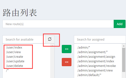 如果你的左侧菜单没有出现我们上图中的/user/*系列路由,请点击其旁边的刷新按钮进行刷新。
