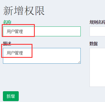 点击新增权限按钮,按照下图添加名称和描述即可