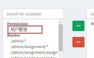 5、我们访问角色列表页面 /admin/role/index 添加角色,只填写名称和描述即可,添加成功后会跳转到角色的详情页面,然后我们按照下图只需要把权限"用户管理"移动过就行了