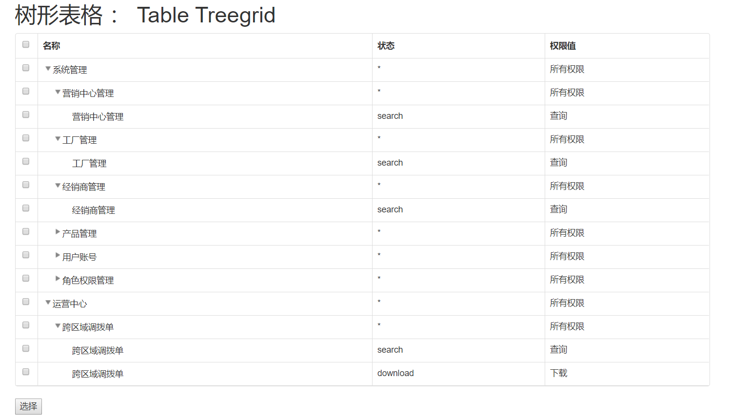 以上所述是小编给大家介绍的Bootstrap table 实现树形表格联动选中联动取消功能,希望对大家有所帮助,如果大家有任何疑问请给我留言,小编会及时回复大家的。在此也非常感谢大家对靠谱客网站的支持!