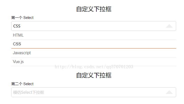 <div id="demo"> <h2 class="title">自定义下拉框</h2> <imitate-select h2-value="第一个 Select" v-bind:list="list1"></imitate-select> <h2 class="title">自定义下拉框</h2> <imitate-select h2-value="第二个 Select" v-bind:list="list2"></imitate-select> </div>