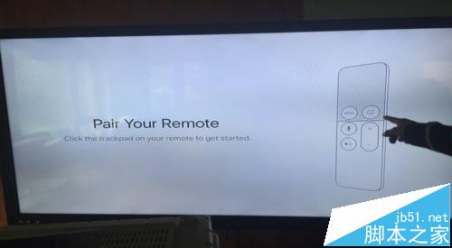 4、打开显示屏后,就会出现配置界面,需要使用遥控器,按压上方的触摸屏表面,如果出现提示信息,请将遥控器靠近 Apple TV。如果遥控器无法连接,请按住 MENU 和调高音量按钮两秒钟。
