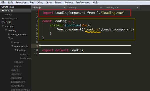 那么上面三个这么违和的框是干什么的么:红色框框:我靠这还用问吗 你调用那个文件你得告诉人间啊 这里当然要调用刚才我们自己创建的loading.vue文件。 黄色框框:我靠这个黄色的框框可以说是本次本文章中重点中的重点 为什么这么说呢 我们要使用自己的组件就要导出这个组件 而这个黄色框框中的代码就是导出自己组件的相应配置 其中那个非常猥琐的浪线则是本例子的”命根子“ 这个命名就是你在其他文件中调用这个组件(这里是loading组件)的名字 在这个例子中我们在调用组件时候就可以写成<Loading></Loading>。白色框框:这个没什么好说的 相当于导出这个组件 在main中好接受!