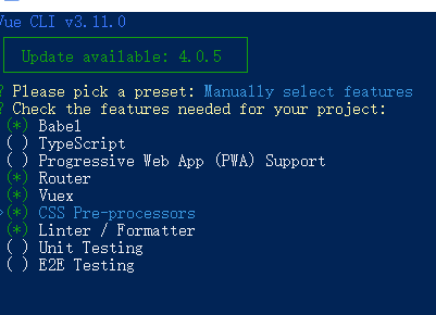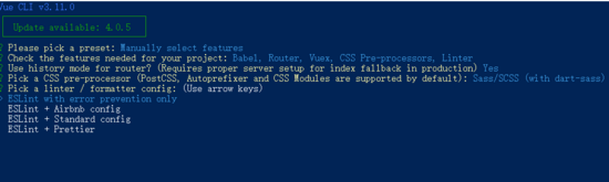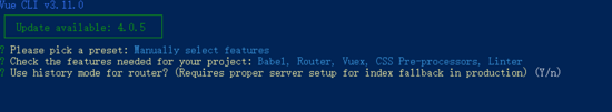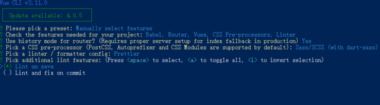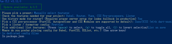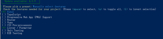 2.2若你之前未保存过preset,或若不使用之前保存的preset创建项目,你会被提示选取一个 preset。你可以选默认的包含了基本的 Babel + ESLint 设置的 preset,也可以选“Munually select features”即“手动选择特性”来选取需要的特性,如下图所示。一般会选择手动选择特性。