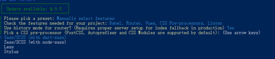 2.4 选择css预处理器,请根据个人情况进行选择,这里我选择的是 Sass/SCSS < with dart-sass>