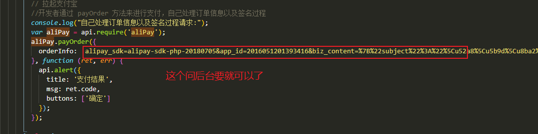 orderInfo: 'alipay_sdk=alipay-sdk-php-20180705&app_id=2016051201393416&biz_content=%........'