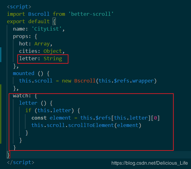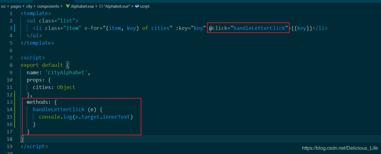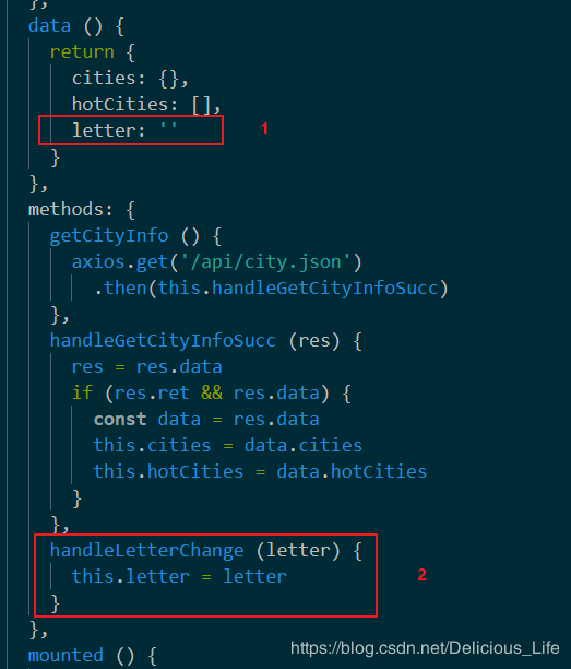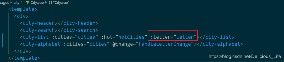 首先我们要在city页面定义一个letter变量,然后在方法中定义用这个变量接受letter