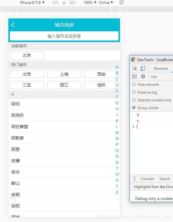 打开页面,可以看到没有问题,city页面监听到了字母表页面的点击