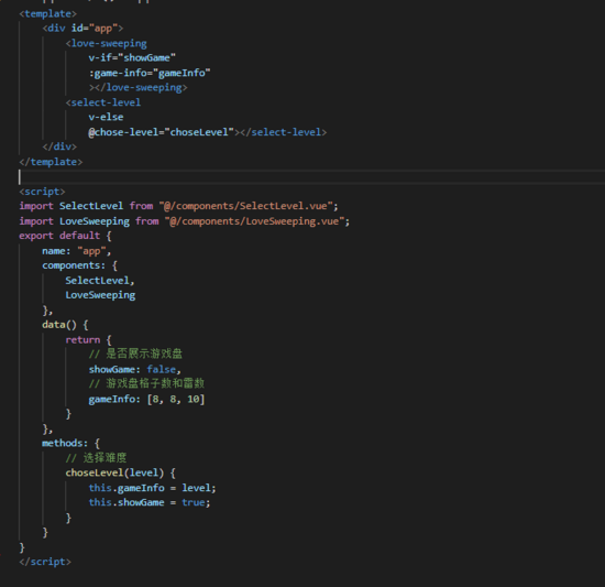- src - components - SelectLevel.vue [新增,难度选择组件] - LoveSweeping.vue [新增,游戏界面组件] - App.vue [父组件,负责组件间的切换和某些数据传递] - main.js - package.json
