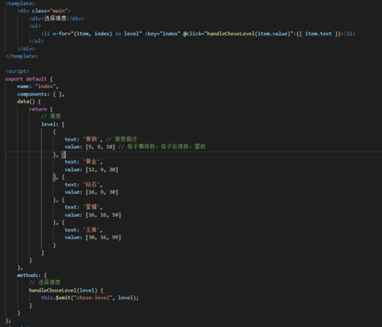 该组件中只有一个方法:选择难度之后,跳转到游戏主界面上去,因为项目没有用路由,直接使用组件间的切换,所以,这个方法只负责告诉父组件,我已经选择好难度了,可以开始游戏了
