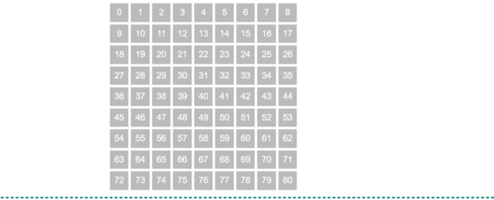 画格子:我们将格子的索引暴露出来,后续可以帮助我们试错。整个格局有两种方式来表示格盘,坐标式和索引式,比如横9纵9的格子,[0, 0]代表第1个格子,[2, 3]代表第三行第四列也就是第20个格子。此次使用索引式来标志格盘