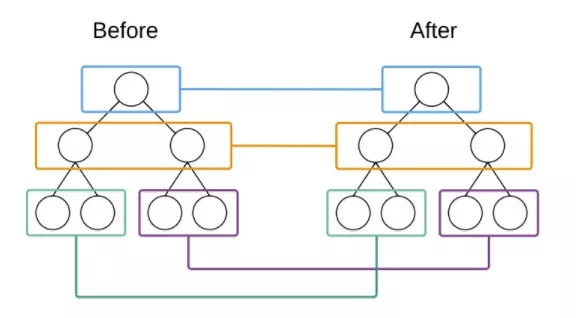 首先讲一下diff算法的处理方法,对操作前后的dom树同一层的节点进行对比,一层一层对比,如下图: