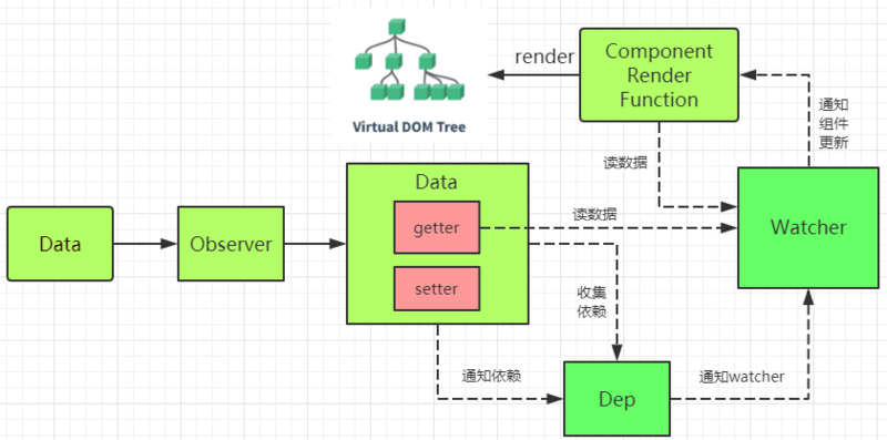 每个组件都对应一个 watcher 实例,它会在组件渲染的过程中把“接触”过的数据属性记录为依赖。之后当依赖项的 setter 触发时,会通知 watcher,从而使它关联的组件重新渲染。
