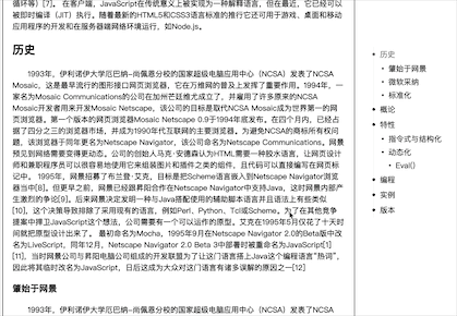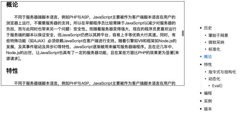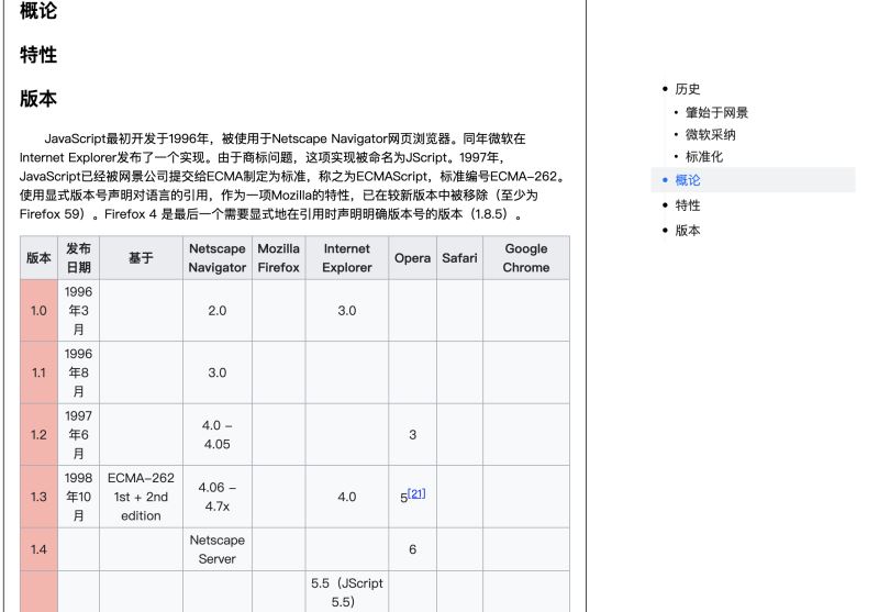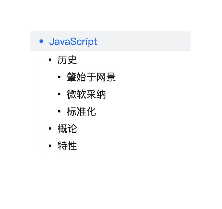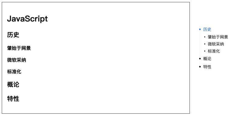 <template> <h1>JavaScript</h1> <h2 ref="t1">历史</h2> <h3 ref="t1-1">肇始于网景</h3> <h3 ref="t1-2">微软采纳</h3> <h3 ref="t1-3">标准化</h3> <h2 ref="t2">概论</h2> <h2 ref="t3">特性</h2> <version ref="t4"/> <!-- ... --> </template>