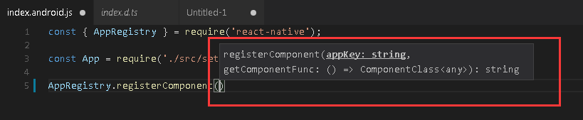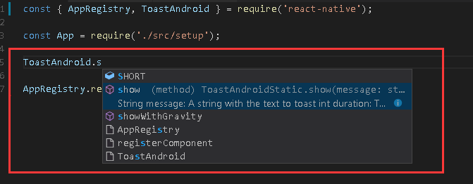 完成后重启一下code , 或者使用reload命令,现在react-native和react相关的代码就有提示说明了,效果如下:
