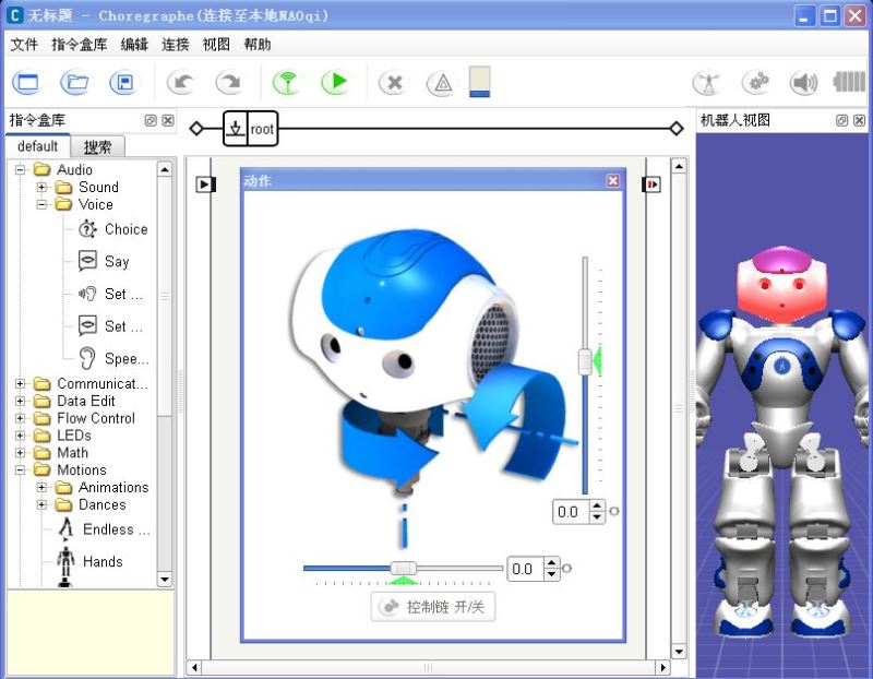 完整的上位机程序需要有三维显示模块、机器人信息监测模块(位置/角度/速度/电量/温度/错误信息...)、通信模块(串口/USB/WIFI/蓝牙...)、控制模块等功能模块。三维显示模块主要用于实时显示机器人的姿态(或位置)信息。比如机器人上肢手臂抬起,程序界面中的虚拟机器人也会同时进行同样的动作。三维显示模块也可以用于对机器人进行控制,实现良好的人机交互。比如在三维图像界面中可以点击拾取机器人某一关节,拖拽部件(肢体)控制真实的机器人完成同样的运动。Aldebaran Robotics的图形化编程软件Choregraphe可以完成上述的一些功能对NAO机器人进行控制。