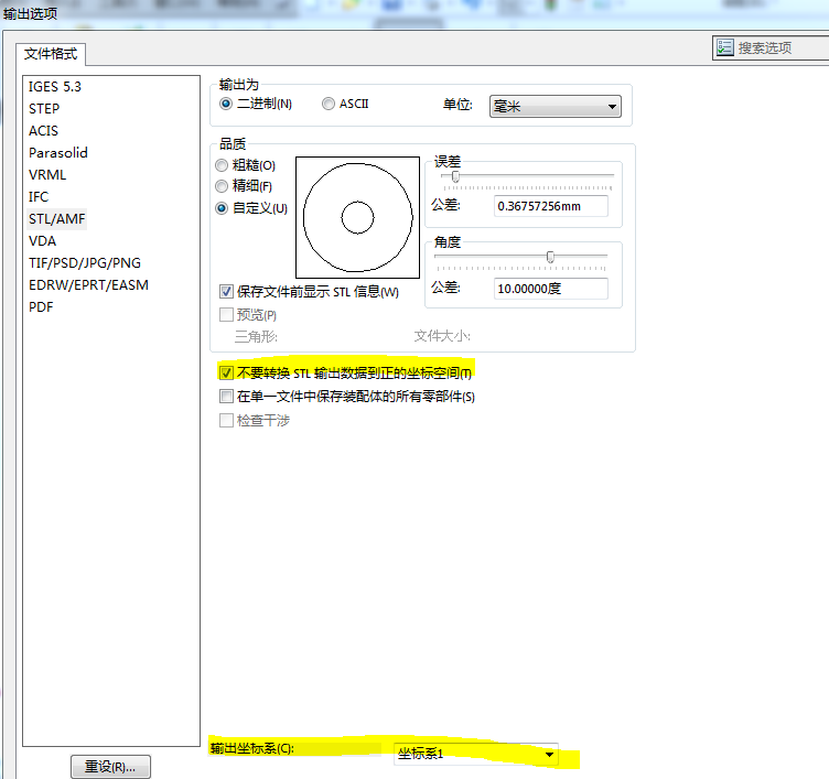 在SolidWorks的另存为STL对话框中,点开输出选项卡,如下图所示。注意之前提到的几点:如果勾选“在单一文件中保存装配体的所有零部件”则会将整个装配体导出为一个STL文件,否则就是分别命名的两个STL文件;输出坐标系下拉列表中选择之前创建的坐标系1,并勾选“不要转换STL输出数据到正的坐标空间”。