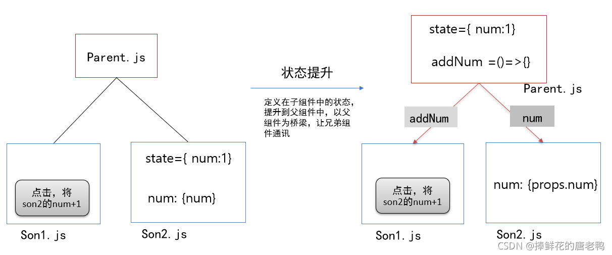在React中没有确定的兄弟组件,就没有这个说法哈,有的只有状态提升.
