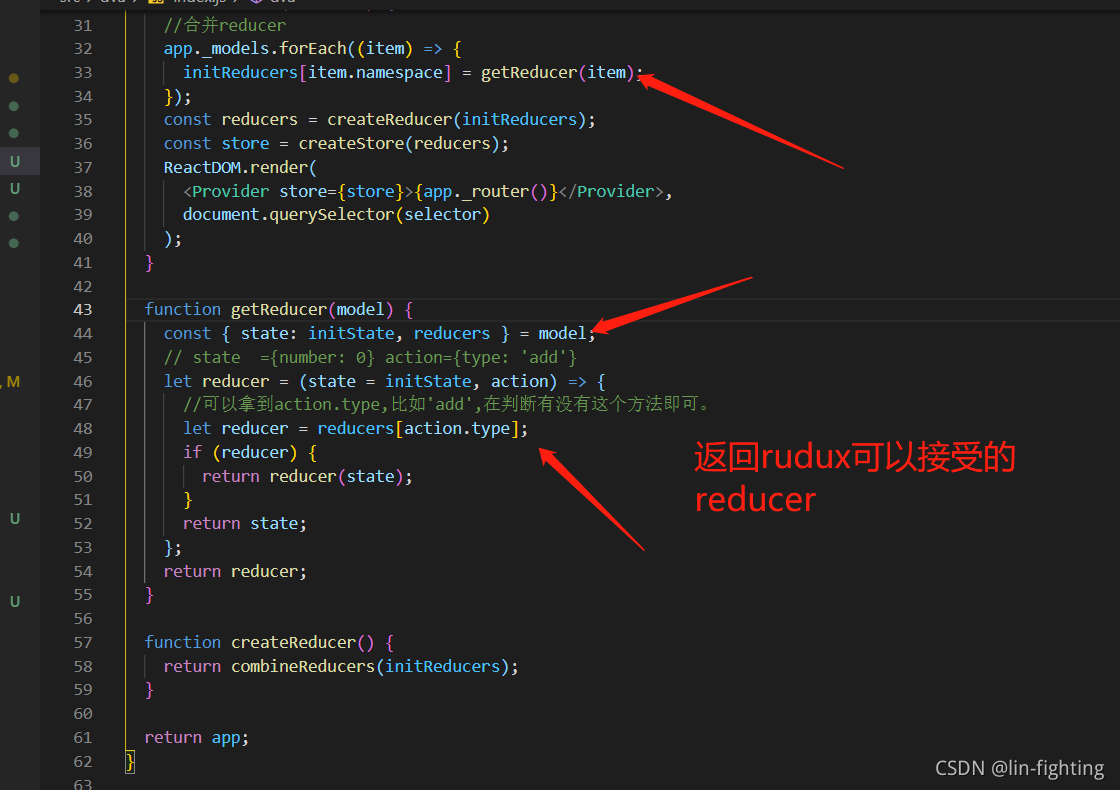 思路:封装一个函数,创建store,通过model收集reducer和state,改变reducer中的方法名字。
