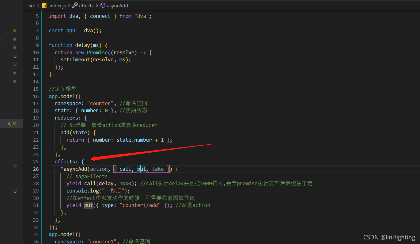 可以看到,每个model的effects会在getSaga被转化为function*(){},然后遍历单个model的effects,对每个属性都做比如*asyncADD(){}处理,如图通过getWatcher返回个saga函数,通过fork开启一个子进程,不会干扰主进程的运行。