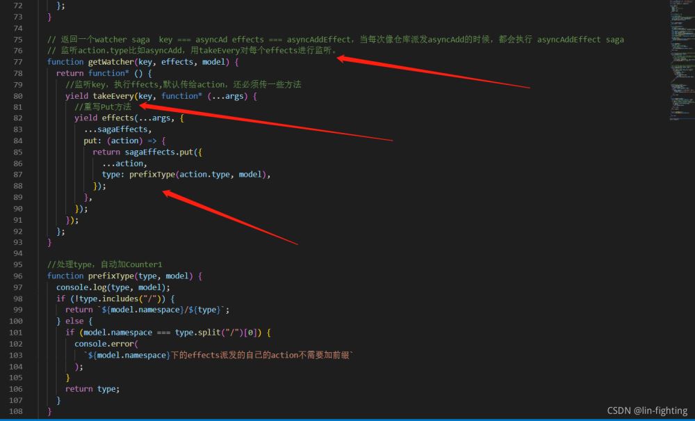 而每个getWatcher返回的就是saga函数(generator函数)他会通过takeEvery监听当前的属性(key)并且执行后面那个effects。这里需要改造一下redux-saga的Put方法,使他单独做一些prefixType的逻辑。