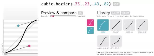 以上代码就是通过设置transform的scale以及透明度, 并且设置一个渐变的径向背景图像来实现水波纹动画的为了实现更优雅的动画,上面的css动画的实现可以借助cubic-bezier这个在线工具,他可以生成各种不同形式的贝塞尔曲线.工具长这样: