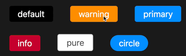 这是button的js部分,也是组件设计的核心, 按钮组件对外暴露了onCpck, className, type, shape, block这几个props, className用于修改组件类名以便控制组件样式, type主要是控制组件的风格, 类似于antd的primary等样式, shape用来控制是否是圆形按钮还是圆角按钮, block用来控制按钮是否是块.具体形式如下: