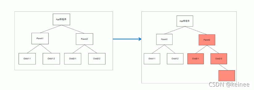 - 过程:父组件重新渲染是,也会重新渲染子组件,但只会渲染当前组件子树(当前组件及其所有子组件)