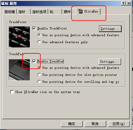 有些人的电脑看不到UltraNav,原因是少装了一个驱动程序,到联想的官网去下载“UltraNav鼠标驱动程序(Windows 7/Vista/XP) 适用机型: ThinkPad E40 ThinkPad E50 ThinkPad L412 ",装上以后就有这个选项了。