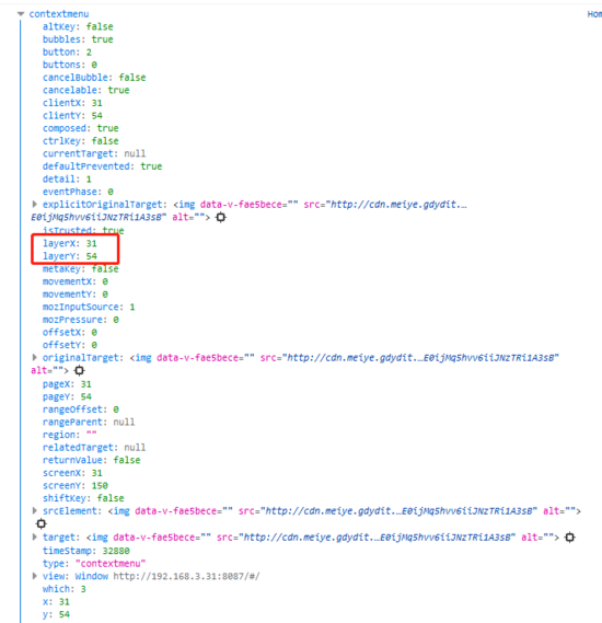 这个是vue内置的,点击右键(阻止默认右键的默认行为)的一个回调方法,他返回了一大串东西这里我用到的是这两个(用于定位显示菜单的x,y位置)