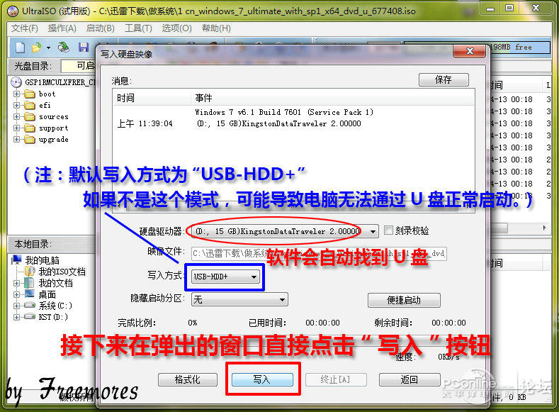 默认写入模式“USB-HDD”, 软件会自己找到U盘(建议操作的时候只插一个U盘)