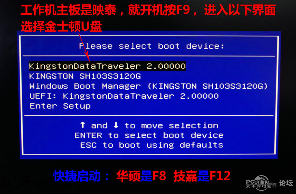 开机按F9进入快捷启动界面,选择金士顿U盘