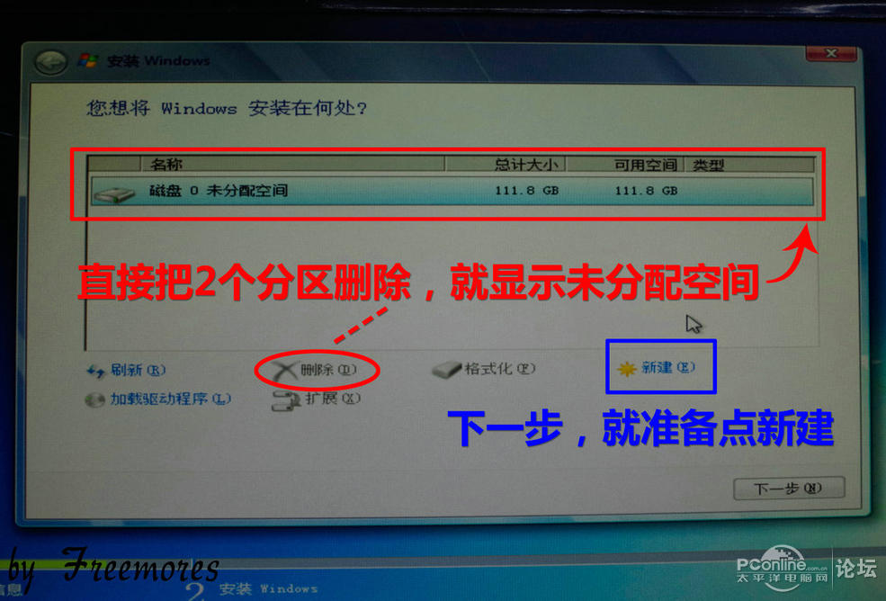 将2个分区删除,再点“新建”如果是新SSD,就是显示“磁盘0未分配空间”,新的SSD就是这样显示的