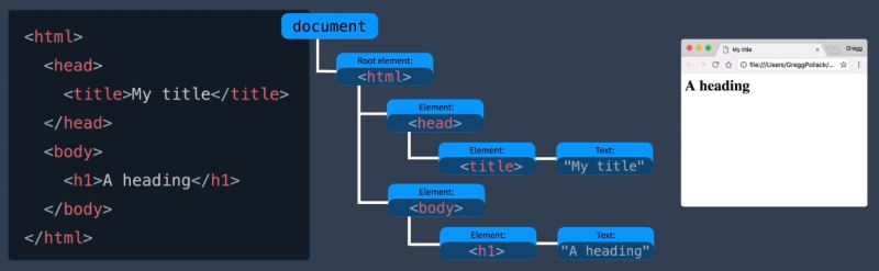 如果我们把这个 HTML 加载到浏览器中,浏览器创建这些节点,用来显示网页。所以这个HTML映射到一系列DOM节点,然后我们可以使用JavaScript进行操作。例如: