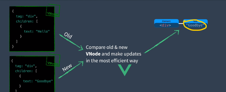 当组件更改时,Render函数将重新运行,它将创建另一个虚拟节点。然后发送旧的 VNode 和新的 VNode 到Vue中进行比较并以最高效的方式在我们的网页上更新。