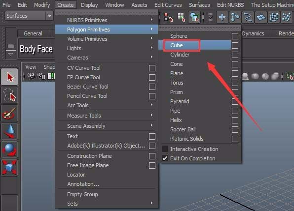 3、点击create菜单,在其子级菜单里找到polygon primitives选项,点击该选项在其下拉菜单里找到cube命令,如图所示: